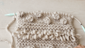 Those are the three components of the pattern! Now repeat them as follows: Garter stitch divider, loop stitch section, garter, bobble, garter, loop