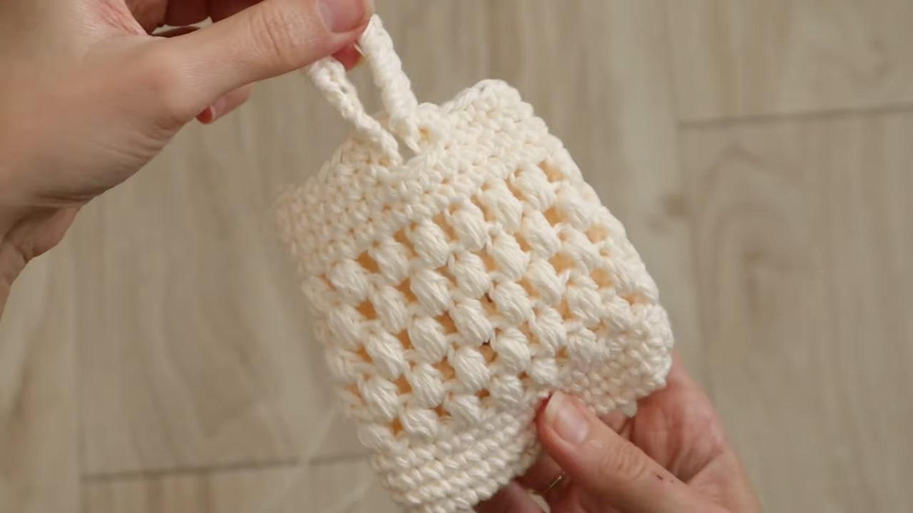 1. Make a slipknot and chain 15 (adjust chain length to be about half inch wider than your soap).2. Skip the first chain, work 1 single crochet (sc) in each chain across (14 sc total).3. Turn the corner: work 2 more sc in the last chain, rotate work, then sc along the underside of the chain (14 sc). You'll have 30 sc total around.4. Begin working in a spiral. Place a stitch marker at the first stitch of round 2. Work 1 sc in each sc around for 4 rounds total.5. Begin puff stitch section: Chain 1, skip marked stitch. *Yarn over, insert hook, pull up a loop* 3 times in next stitch, yarn over and pull through all 7 loops. Chain 1.6. Continue puff stitch pattern: Skip 1 stitch, work puff in next stitch, chain 1. Repeat around.7. Work puffs into chain-1 spaces from previous round, continuing in a spiral for 5 rounds of puffs total.8. Level off the top: Work 1 dc in next chain space, 1 hdc in marked stitch, 1 sc in next space.9. Work 2 rounds of sc (1 sc in top of each puff and 1 sc in each chain space).10. On round 3, fold piece flat to find center 3 stitches. Work to center, chain 3, skip 3 stitches, sc in next stitch (this creates the closure hole).11. Continue to back center. Chain 15 for hanging loop, skip 1 stitch, sc in next stitch.12. Complete the round in sc. Work one more round, putting 3 sc into the chain-3 opening and 15 sc into the hanging loop chain space.13. Slip stitch in next couple stitches, fasten off, and weave in ends.